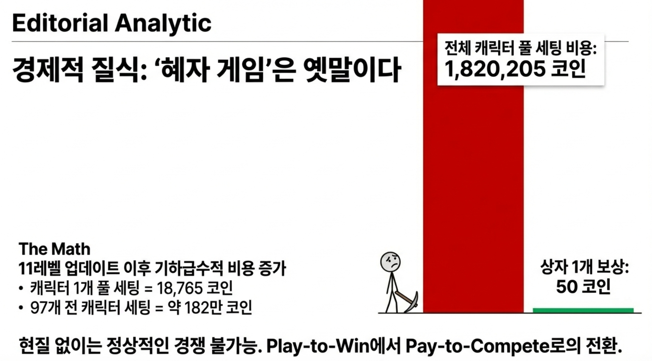게임 내 경제 시스템의 급격한 우경화는 라이트 유저들의 숨통을 조였습니다. 11레벨 확장 이후 캐릭터 하나를 풀 세팅하는 데 필요한 코인은 18,765개입니다. 현재 97개의 캐릭터를 모두 육성하려면 무려 182만 25코인이라는 천문학적인 재화가 필요합니다.