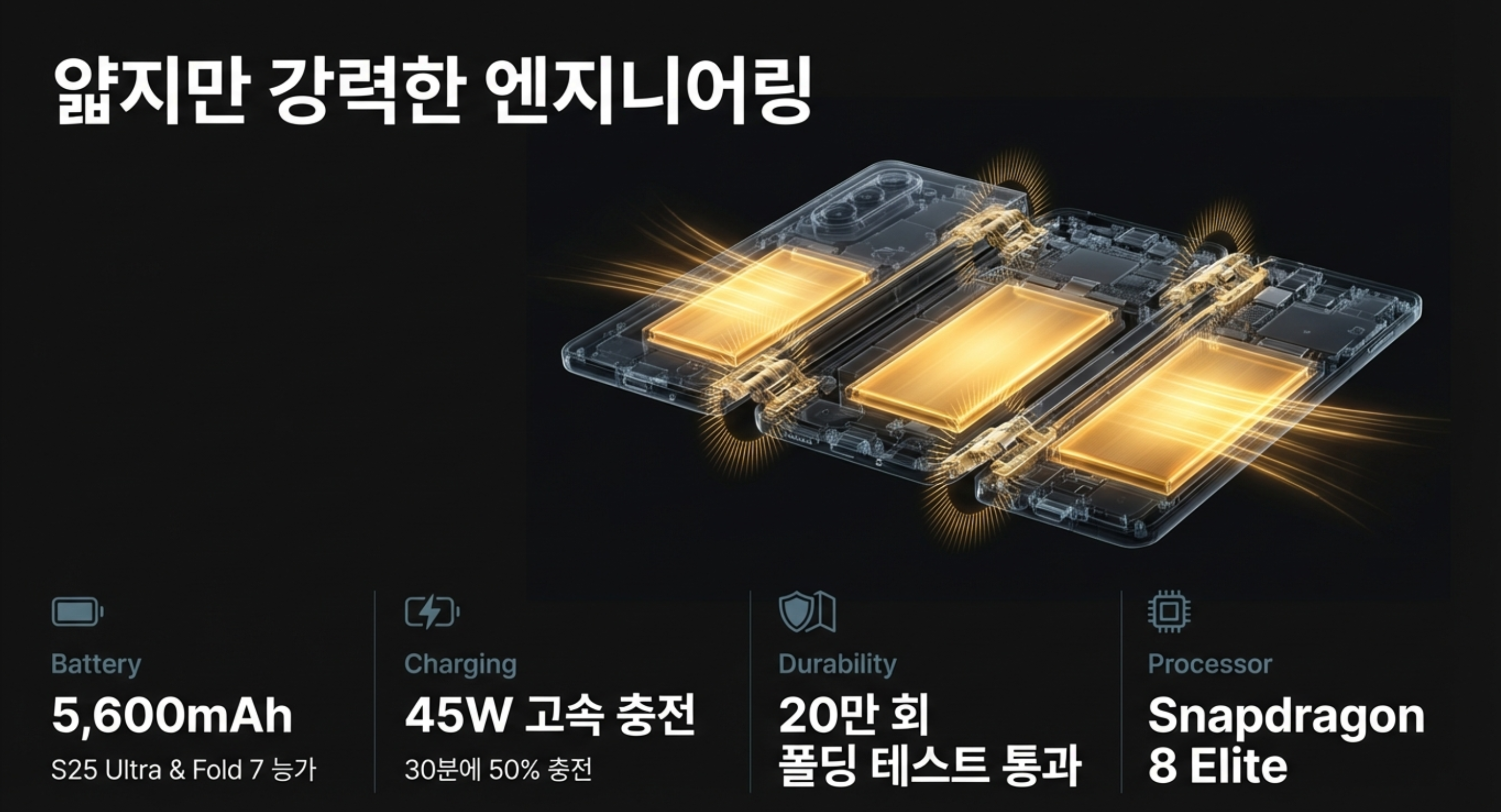 - 경이로운 슬림함: 펼쳤을 때 두께는 3.9mm로 갤럭시 Z 폴드7(4.2mm)보다도 얇습니다. 모두 접었을 때의 두께 역시 12.9mm로 갤럭시 Z 폴드5보다 슬림하여 주머니에 들어가는 '두께'만큼은 확보했습니다.