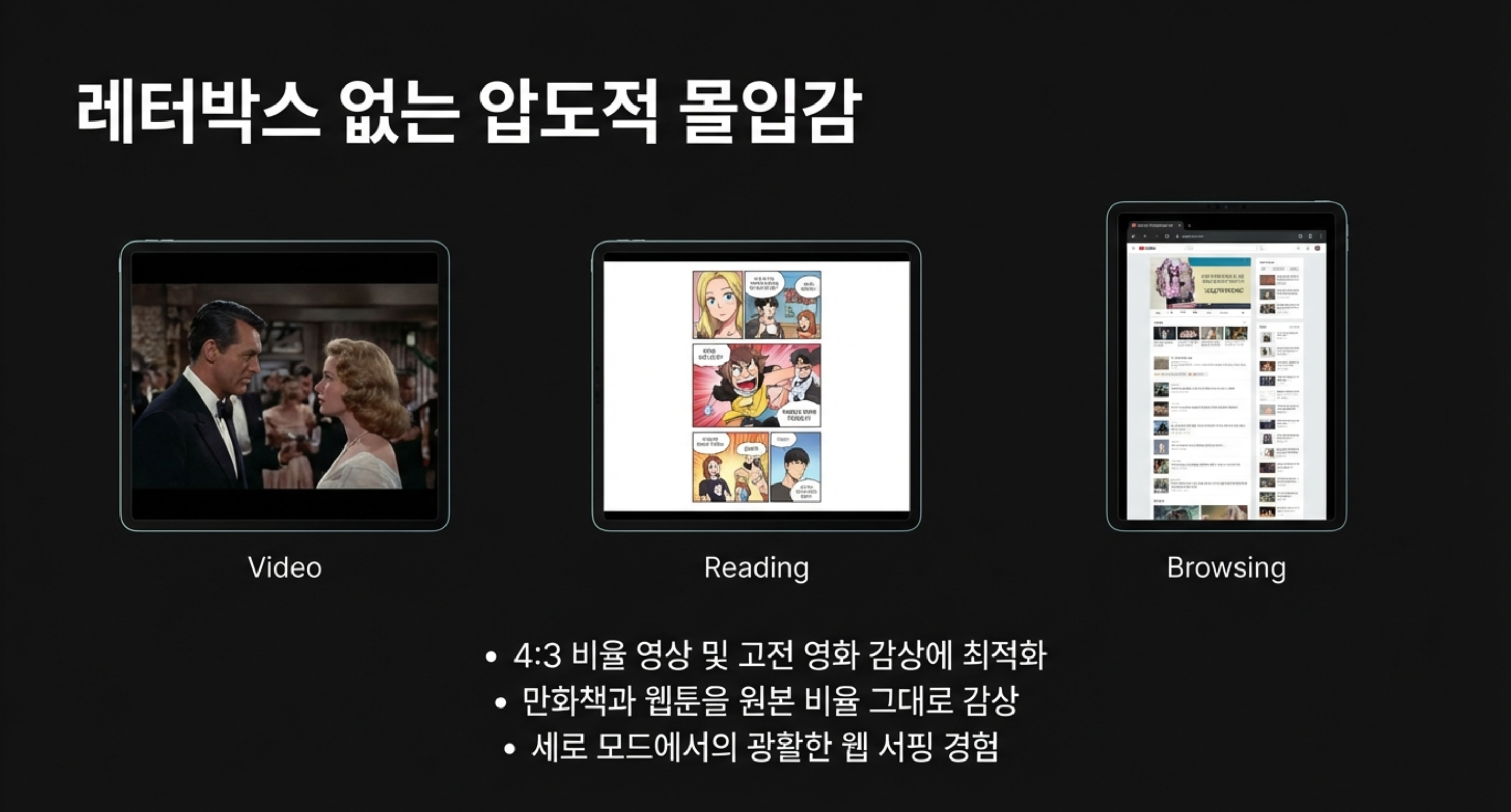- 10인치의 압도적 개방감: 펼쳤을 때 나타나는 10인치(1584 * 2160) 디스플레이는 아이패드 미니(8.3인치)보다도 월등히 큽니다. 특히 4:3 비율의 콘텐츠 시청 시 기존 폴더블에서 느껴지던 레터박스의 아쉬움을 완벽히 해소하며 압도적인 몰입감을 제공합니다.